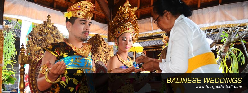 The procedure of the Balinese wedding blessing ceremony is as the following: at 16.00 hrs. the couple arrives at the village temple for spiritual blessing, then they will be escorted to the Balinese traditional houses each one with their respective family temple, where the art of making daily offerings is learned and the then an old man of the village will read your destinies based on the Balinese horoscope old book. Afterwards the welcome drink is offered. Continuing the program, we proceed to the wedding venue, where a purification ceremony masegehan is held, then followed by arrangement of your hair and facial makeup and then the Balinese royal wedding dress will be put on. Afterwards the royal procession in which the couple sit on the real palanquins carried by four men, the Byakala offerings will take place to cleanse the couple spiritually, followed by Prayascita offerings to purify the body and soul led by the lay priest and finally the sacred grains of rice will be placed on the front head symbolizing the hope for the fertility, prosperity and happiness.